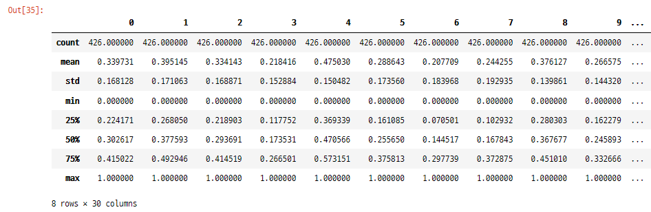 >> 데이터의 각 열마다 다른 scale이 모델에 영향을 주기 때문에 데이터 스케일링(전처리)이 필요함을 알 수 있음