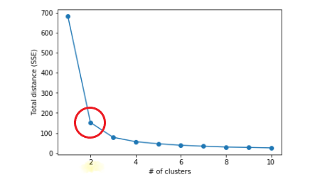 그래프 모양에서 팔꿈치에 해당하는 부분(inertia가 꺾이는 지점)이 바로 최적의 클러스터 수