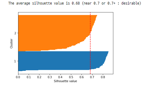 print('The average silhouette value is', round(silhouette_avg, 2), '(near 0.7 or 0.7+ : desirable)')
