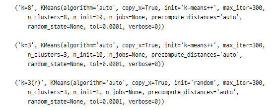 estimators = [('k=8', cluster.KMeans(n_clusters=8)), # 클러스터 수 8
