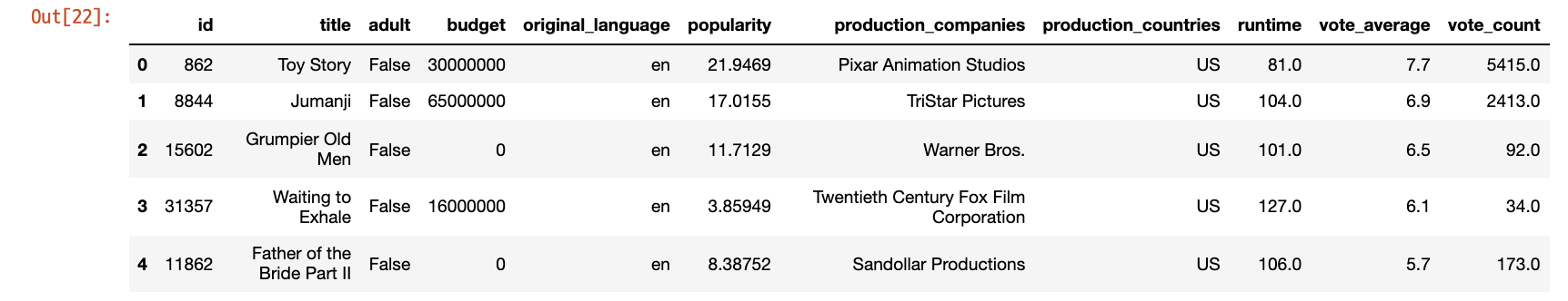 meta_columns = ['id', 'title', 'adult', 'budget', 'original_language', 'popularity', 'production_companies', 'production_countries', 'runtime','vote_average', 'vote_count']