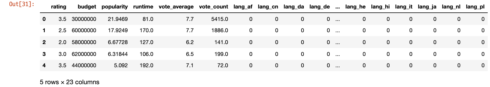 x_columns = ['rating', 'adult', 'budget', 'original_language', 'popularity', 'runtime', 'vote_average', 'vote_count']