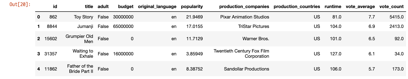 meta_columns = ['id', 'title', 'adult', 'budget', 'original_language', 'popularity', 'production_companies', 'production_countries', 'runtime','vote_average', 'vote_count']