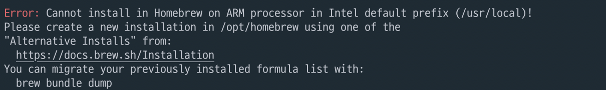 "prefix (/usr/local) 기본 설정의 인텔 기반 ARM processor의 Homebrew에 설치할 수 없습니다!" 이런 의미일려나