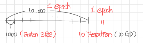 - Epoch : 모든 데이터에 대해 한번씩 모두 학습시킨 횟수