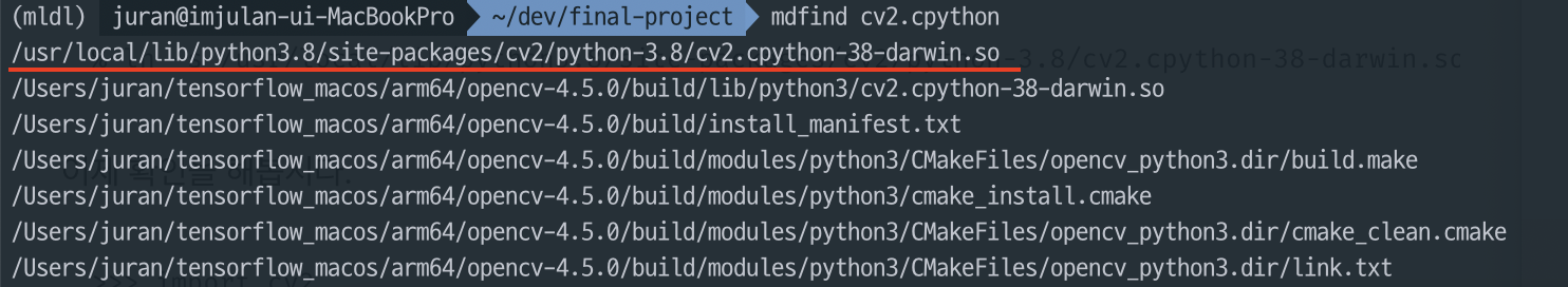 여기서 중요한 것은 저 python-3.8/cv2.cpython-38-darwin.so 의 경로