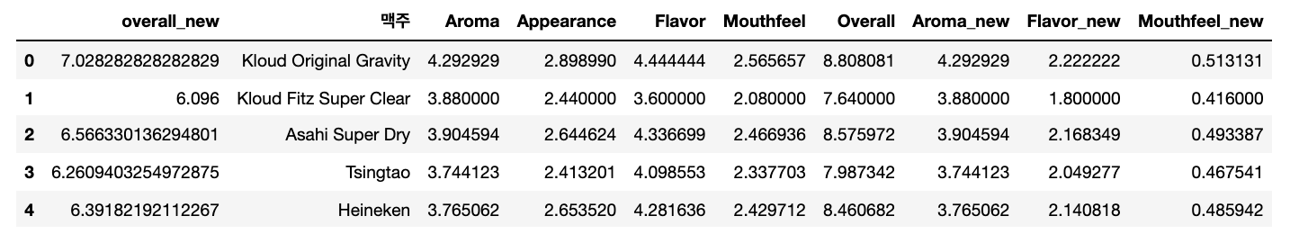 beer_list = list(del_rated_beer(tmp, user, i).sort_values(i, ascending=False)['맥주'][:5])