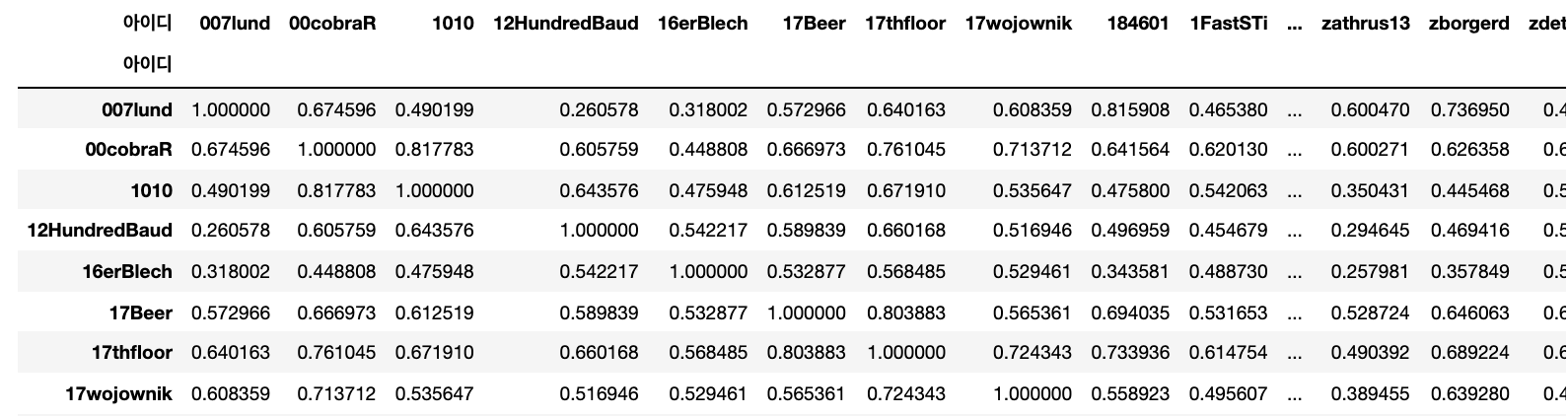 # 아이템-유저 매트릭스로부터 코사인 유사도 구하기