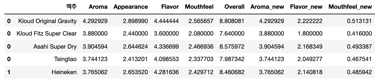 (이전 포스팅에서 맥주 이름을 유니크값으로 만들어 항목별 평균값을 계산한 데이터프레임 이어서 이용)