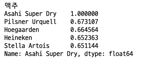 '평점' 컬럼으로 코사인 유사도 계산하여 기준이 되는 맥주와 유사한 맥주 추천