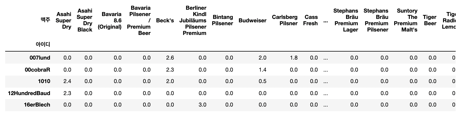 id_matrix = data.pivot_table(index='아이디', columns='맥주', values=feature)