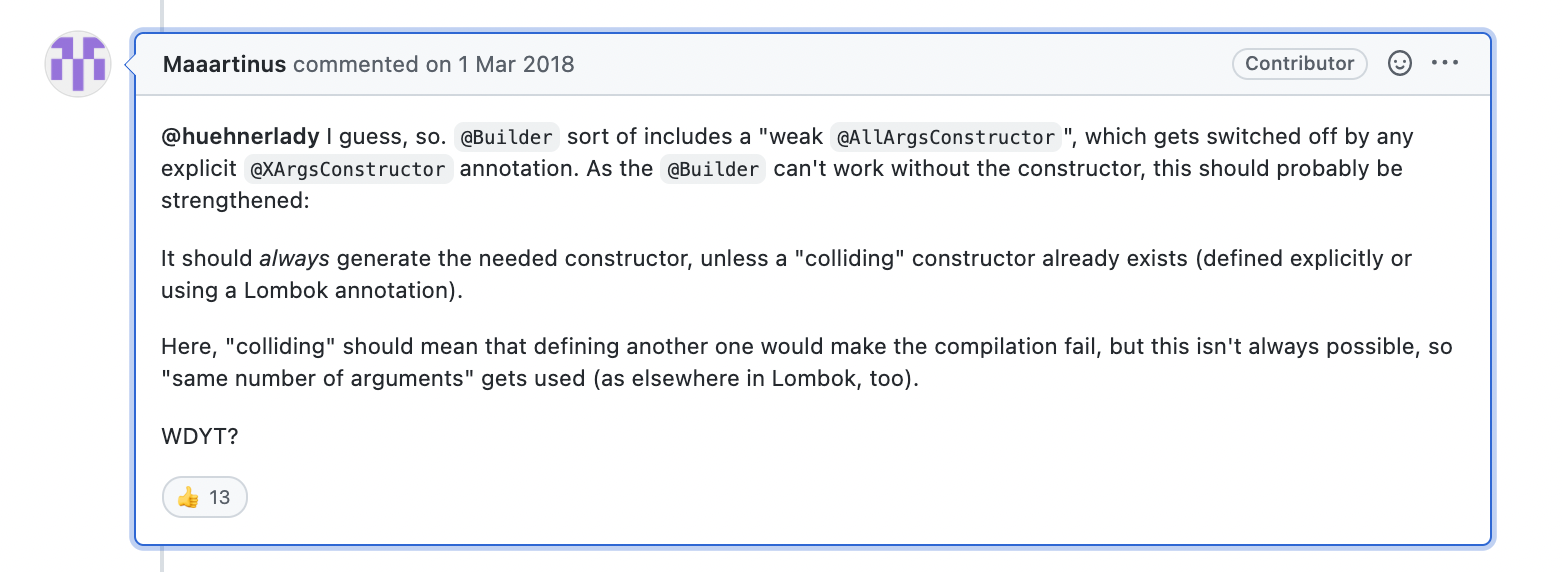 Finally, applying @Builder to a class is as if you added @AllArgsConstructor(access = AccessLevel.PACKAGE) to the class and applied the @Builder annotation to this all-args-constructor. This only works if you haven't written any explicit constructors yourself. If you do have an explicit constructor, put the @Builder annotation on the constructor instead of on the class. Note that if you put both '@Value' and '@Builder' on a class, the package-private constructor that '@Builder' wants to generate 'wins' and suppresses the constructor that '@Value' wants to make.
