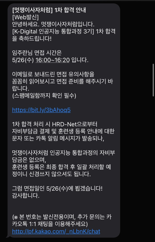 나중에 수업들을때보니 나랑 면접분 분 중 다른 한 분만 붙은 듯 하였다.