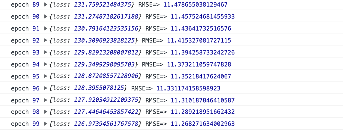 console.log('epoch', epoch, logs, "RMSE=>", Math.sqrt(logs.loss));