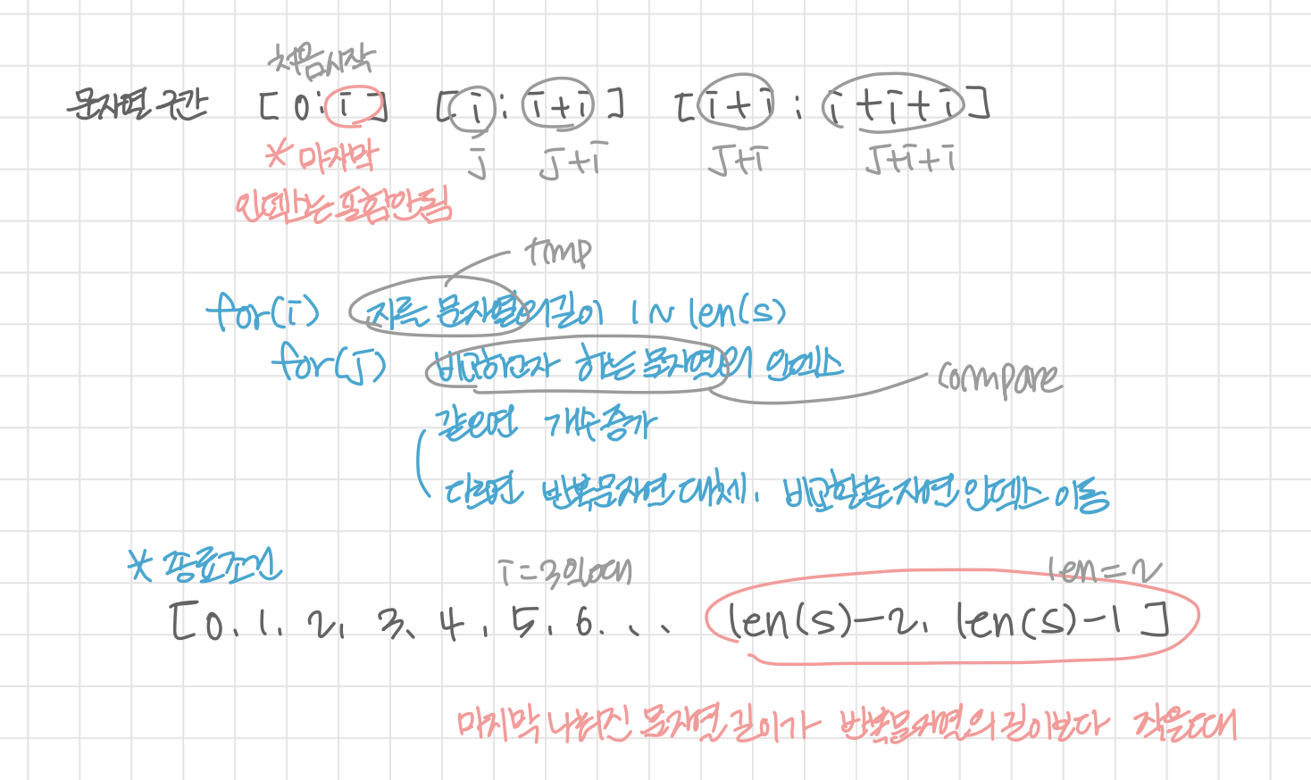 * 위에서 j에 i를 한번 더해줬기 때문에 j-i에 마지막 조각과 기준조각 길이가 같은 경우에도 끝내기 위해 -1까지 해줌
