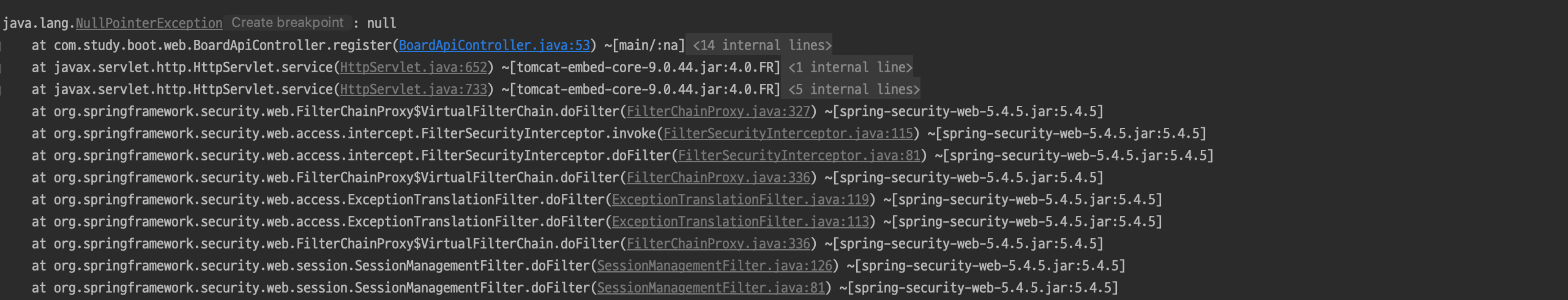 BoardRequest로 받은 객체에서 get으로 값을 조회하려 하니 저렇게 널포인터에러가 뜬다.