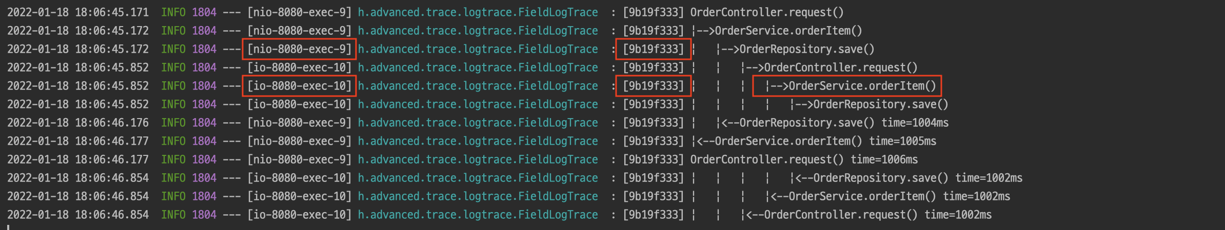 INFO 2362 --- [nio-8080-exec-4] h.a.trace.logtrace.ThreadLocalLogTrace : [4b4c3f63] |<--OrderService.orderItem() time=1004ms
