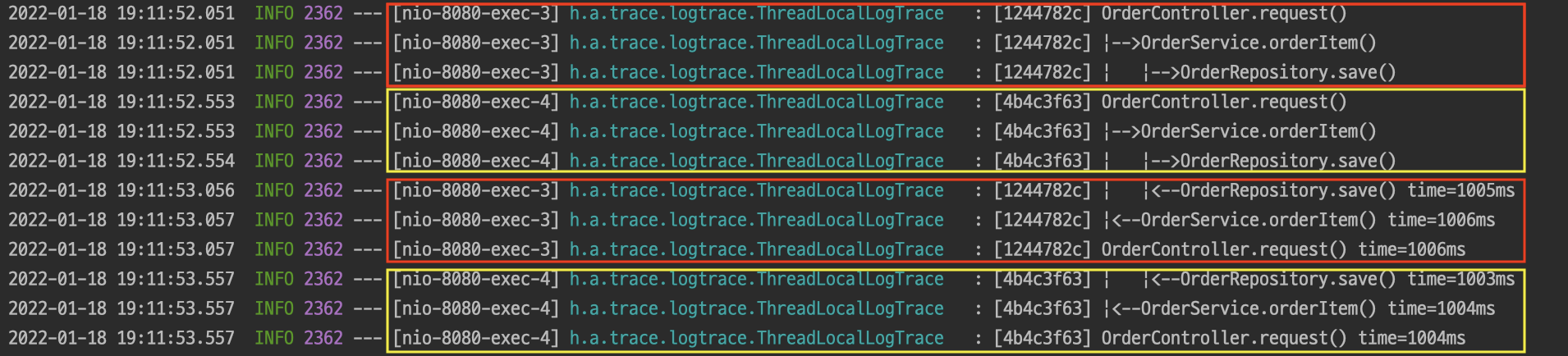 INFO 2362 --- [nio-8080-exec-4] h.a.trace.logtrace.ThreadLocalLogTrace : [4b4c3f63] OrderController.request() time=1004ms