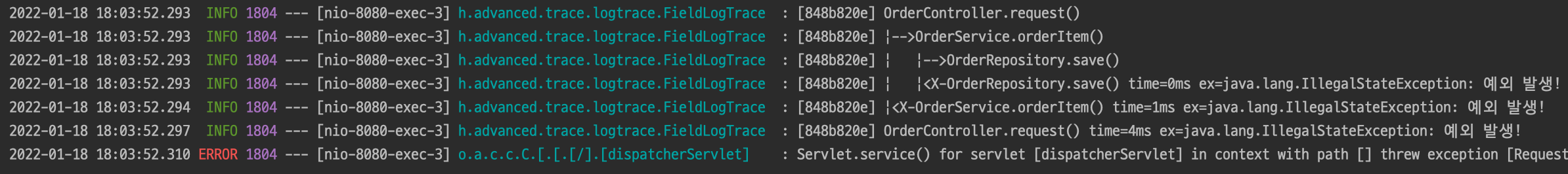 INFO 2362 --- [nio-8080-exec-3] h.a.trace.logtrace.ThreadLocalLogTrace : [1244782c] | |-->OrderRepository.save()