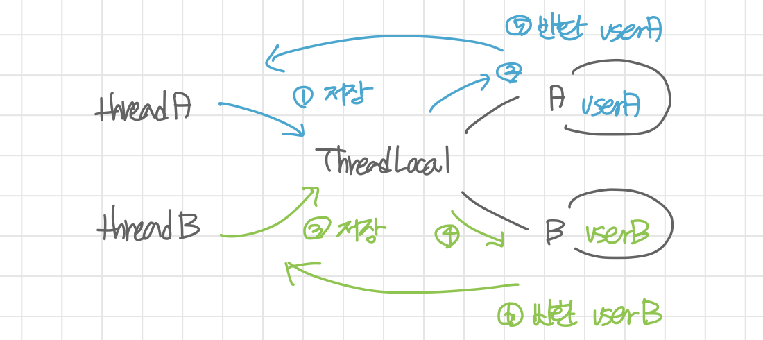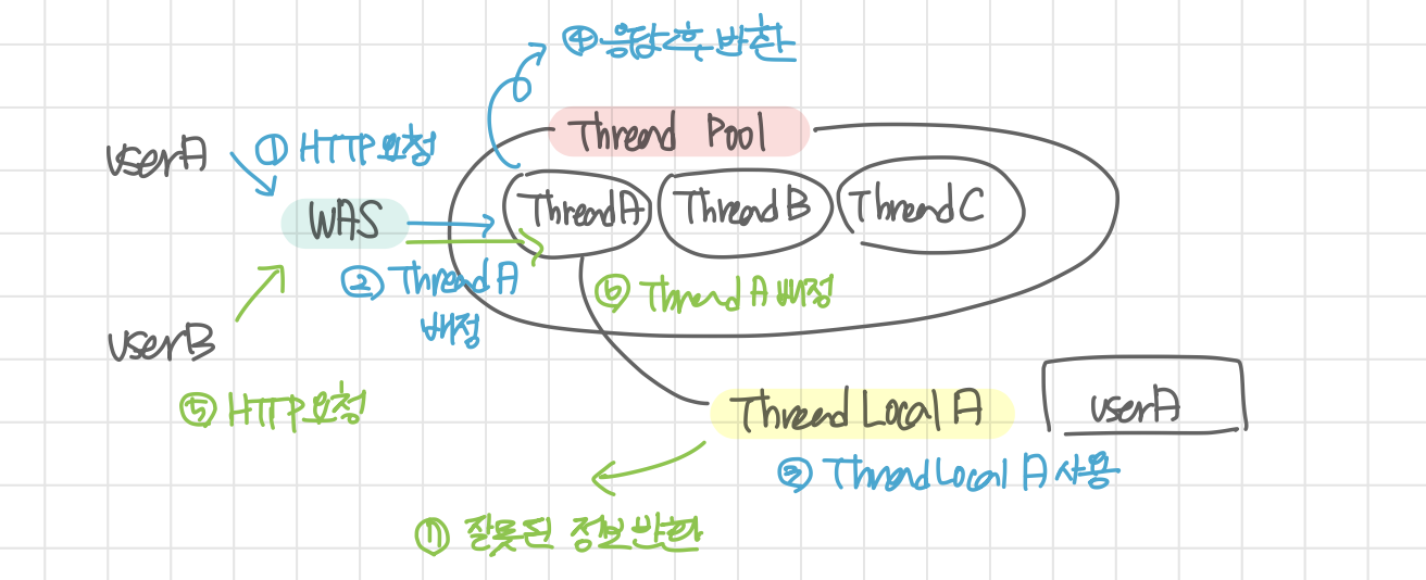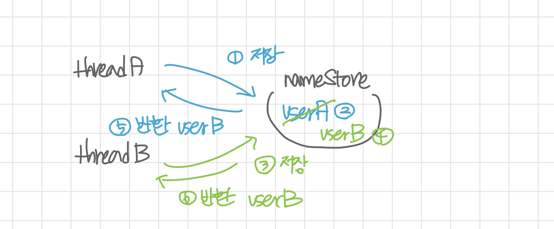 그림에서처럼 threadA가 저장한 userA가 반환되기 전 userB가 다시 저장되어 잘못된 값을 반환하게 된다.