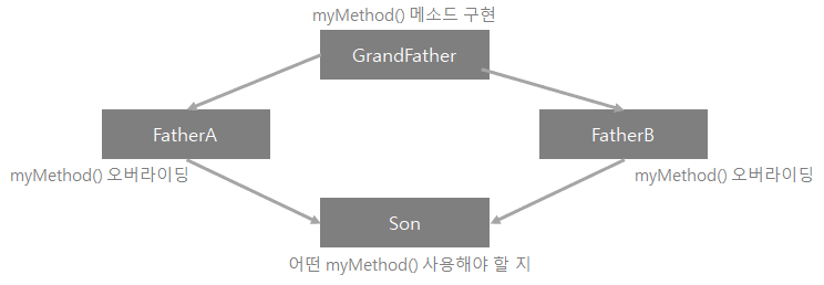 C++는 다중 상속이 가능하지만 자바는 다중 상속이 불가능하다(단 인터페이스는 다중상속을 할 수 있다).