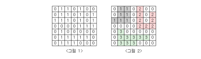 정사각형 모양의 지도가 있고 1은 집이 있는 곳, 0은 집이 없는 곳을 나타낸다. 철수는 이 지도를 가지고 연결된 집의 모임에 단지를 정의하고 번호를 붙이려 한다. 연결되어있다는 것은 어떤 집이 좌우, 혹은 아래위로 다른 집이 있는 경우를 말하며 대각선상 있는 집은 연결된 것이 아니다. 지도를 입력하여 단지수를 출력하고 각 단지에 속하는 집의 수를 오름차순으로 정렬하여 출력하라