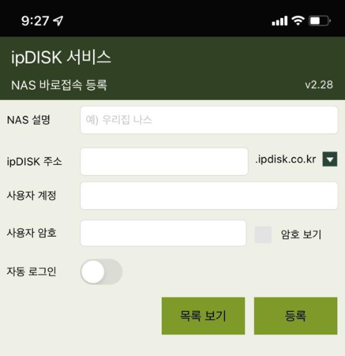 어플을 실행시켜 NAS 신규 등록을 누르면 NAS 정보 입력하는 란이 나온다.
