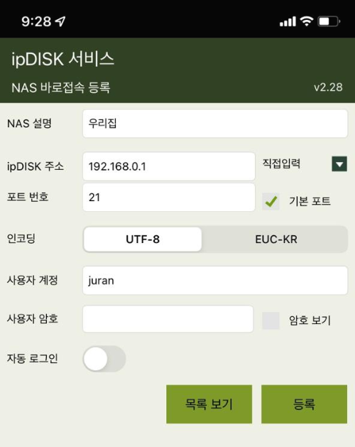 iptime 주소인 192.168.0.1과 포트는 기본, 로그인 정보를 기입하고 등록하면 접속 성공