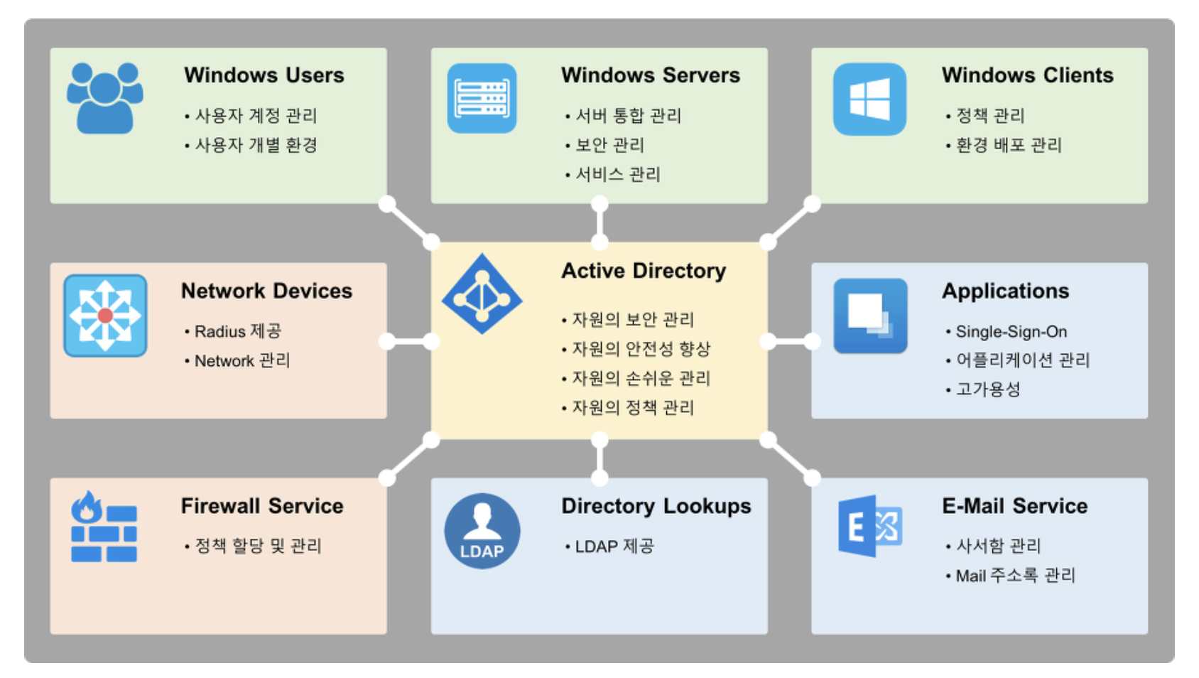 기업 환경에서 다수 사용자의 자원과 정보(아이디나 비밀번호 등)를 통합하여 관리하기 위해 사용하는 디렉터리 서비스