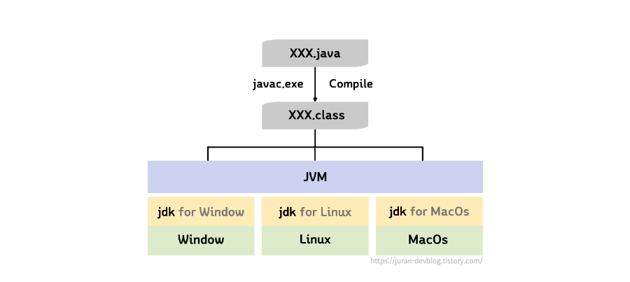 여기서 JVM을 제공하는 jdk 자체는 OS 의존적이다. 각 운영체제에 맞는 jdk를 설치해야한다.