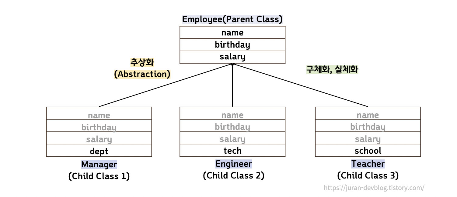 아래 세 직업군의 필드 중 name, birthday, salary 필드는 공통으로 들어가는 필드들이다. 이런 공통점들을 모아 Employee라는 객체를 만들었다. 이 과정을 추상화라고하며 Employee 객체를 가지고 Manager, Engineer, Teacher 라는 객체를 구현하는 것을 구체화 또는 실체화라고 한다.