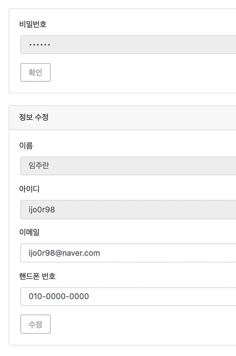 사용자 본인의 정보 수정을 하기 전 비밀번호를 입력하여 본인확인 절차를 거치도록 하였다.