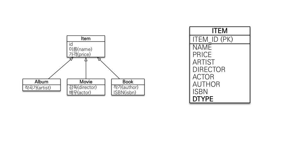 단점 : 자식 엔티티가 매핑한 컬럼에 모두 null 허용이 적용됨 / 테이블이 커질 경우 오히려 조회 성능 저하될 수 있음