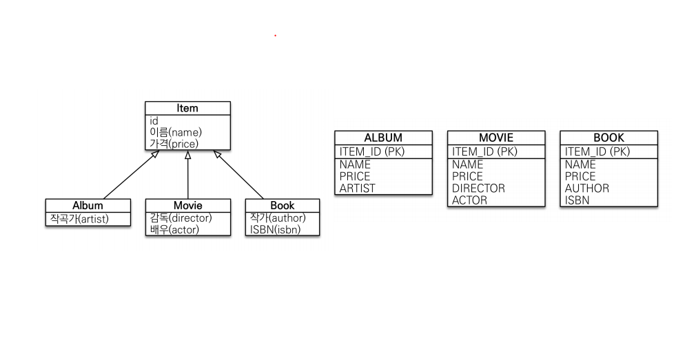 단점 : 여러 자식 테이블을 함께 조회할 때 성능이 느림 (UNION SQL 필수) / 자식 테이블을 통합해서 쿼리하기 어려움