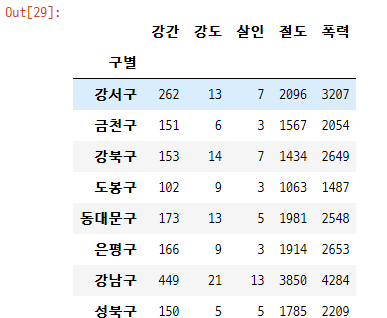 gu_df[gu_df[['강간검거율', '강도검거율', '살인검거율', '절도검거율', '폭력검거율']] > 100] = 100