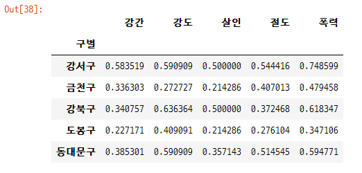- 각 5대 범죄별 발생 수치를 해당 범죄의 최대값으로 나눠줌