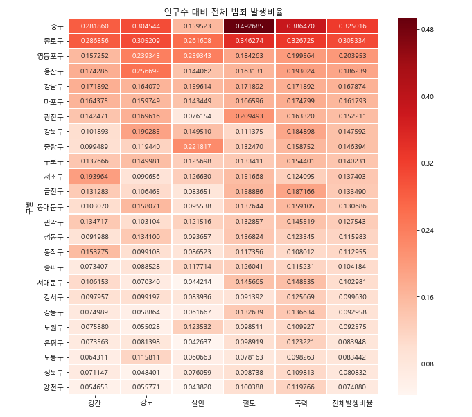# 인구 수 대비 구별 5대 범죄 발생비율