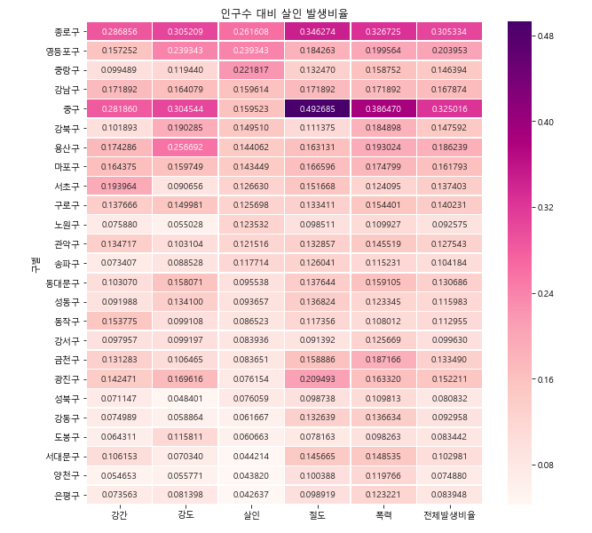 인구 수 대비 5대 범죄 발생 비율 기준 구별 데이터 & 경찰서별 검거율 데이터 시각화