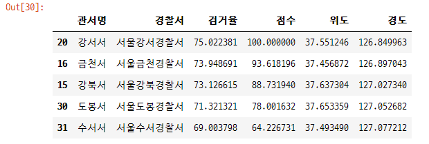 경찰서 위치 데이터 및 경찰서별 검거율 계산