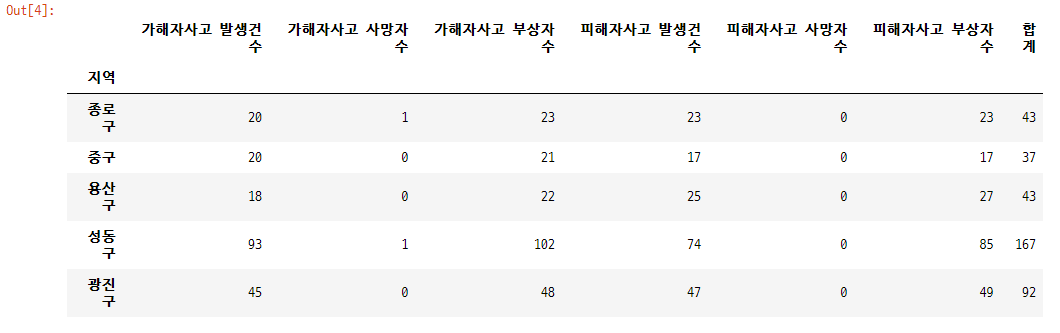 df_bic_acc['합계']=df_bic_acc['피해자사고 발생건수'] + df_bic_acc['가해자사고 발생건수'] # 합계 열 추가