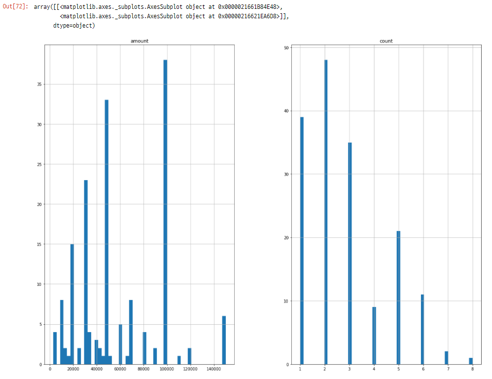 예시) 연 구매 횟수(count)와 1회 평균 구매 비용(amount)을 기준으로 히스토그램 plot