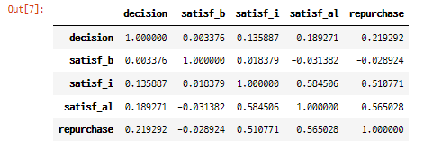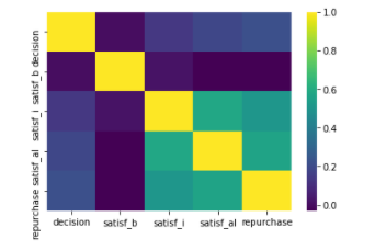df_corr = df[['decision', 'satisf_b', 'satisf_i', 'satisf_al', 'repurchase']]