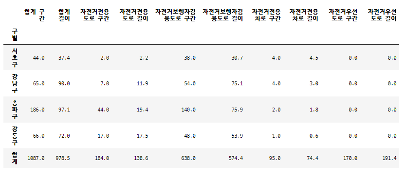 df_bic_road_csv.loc['합계'] = (df_bic_road_csv.sum(axis=0).values)