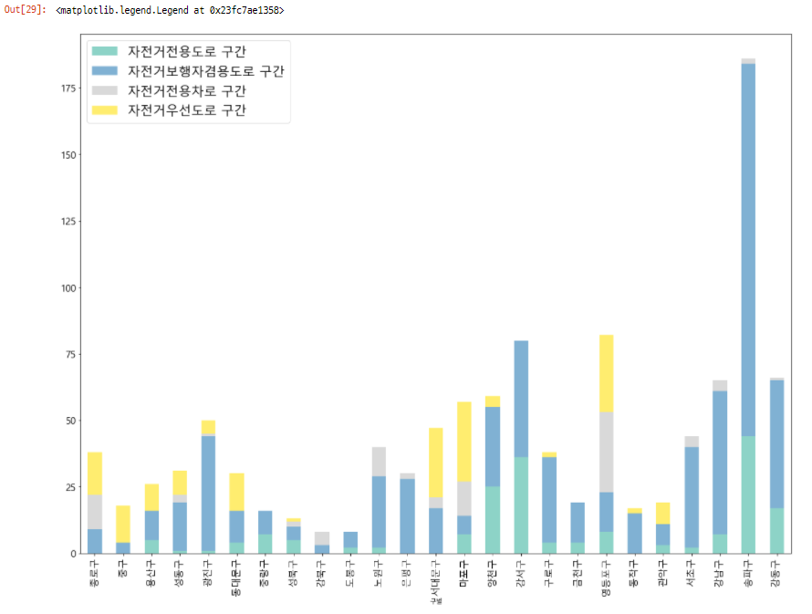 구 별 전체 자전거 도로 수와 각각의 도로 종류별로 얼마나 차지하는지 보여주기에 효율적이라 생각되어 추가