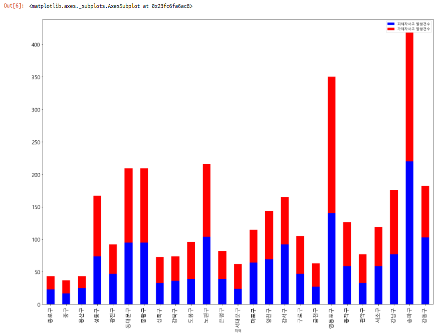 이전에는 [인구 수 대비 자전거 도로 수 데이터]로 인구 팝업과 색상이 표시된 지도 시각화를 하였으나 인구 수에 비례하여 교통사고 발생 수를 보여주는 것이 더 중요하다고 생각되어 이전의 지도 시각화는 삭제하고 새로 추가