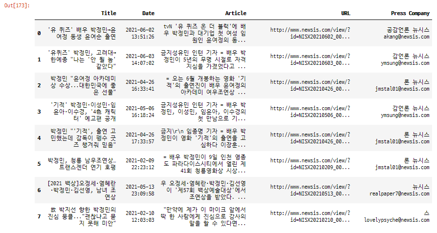 df = make_dateframe(titles, dates, articles, urls, press_companies)| [K-DIGITAL] 파이썬 텍스트 데이터 분석 (0) | 2021.06.25 |