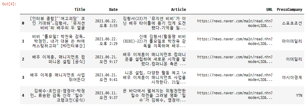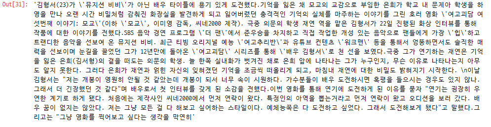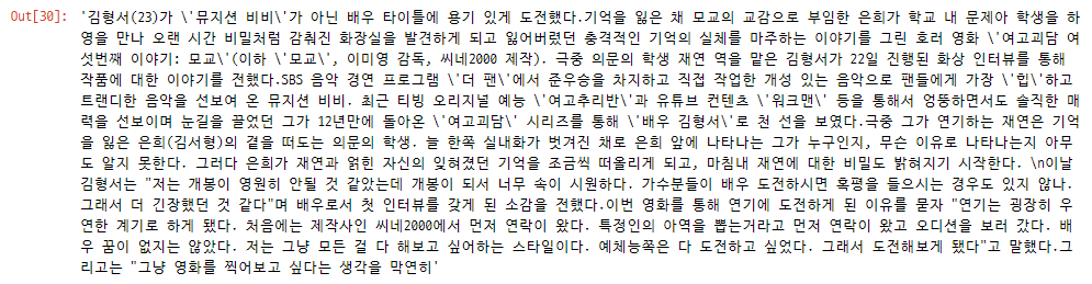 기사의 본문(df.Article) 모아서 하나의 리스트로 모음
