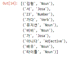 for word in raw_pos_tagged: # ('서울', 'Noun'),