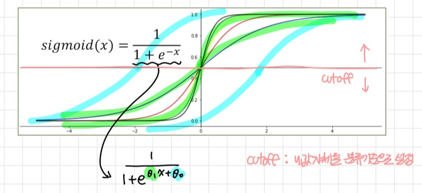 - sigmoid 함수의 정확한 y값을 이용하여 그 값(cutoff)을 넘는 경우 분류에 대해 예측할 수 있음