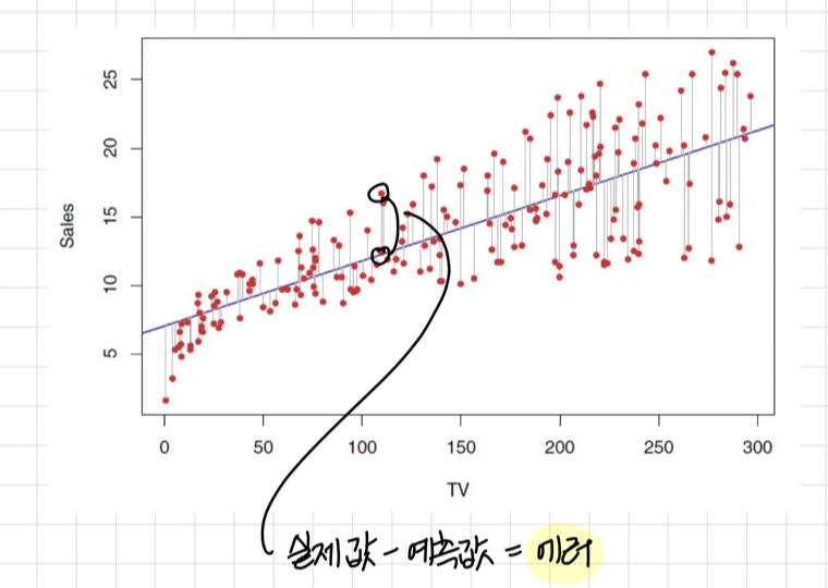 선으로 나타난 그래프는 모델의 예측값이고 점으로 찍힌 값들은 실제 값이며 이 두 값의 차이가 에러